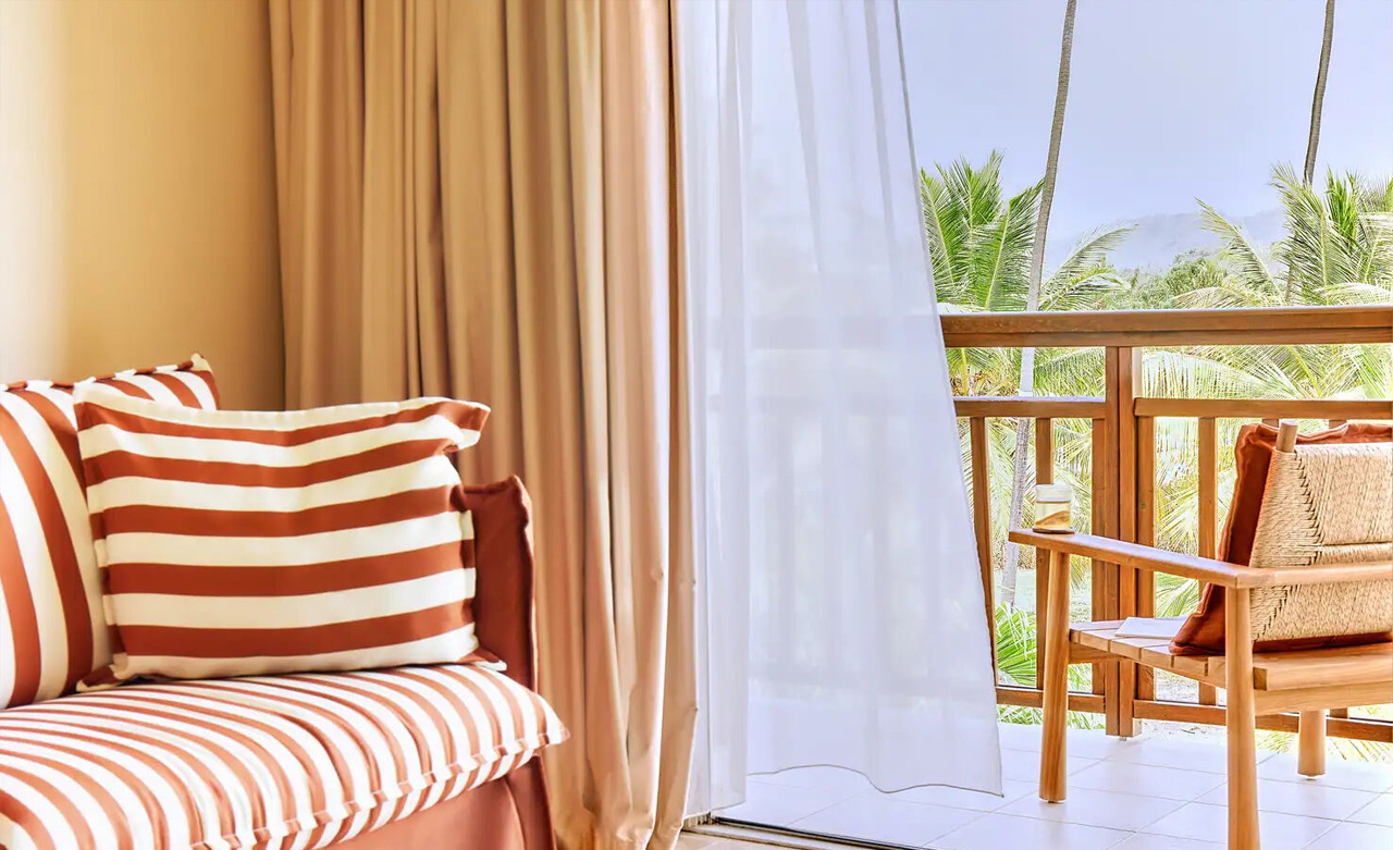 Die Einrichtung dieses Zimmers verbindet modernen Komfort mit einer tropischen